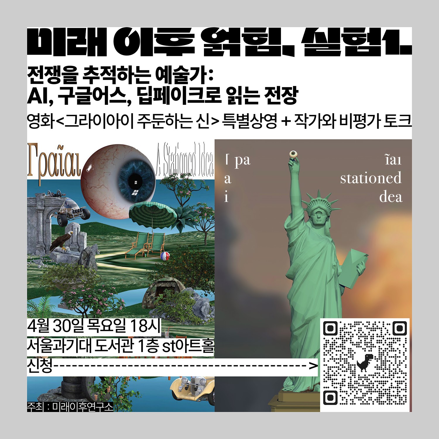 서울과학기술대학교 미래이후연구소가 새로운 콜로키움 시리즈 「미래 이후 얽힘, 실험」을 진행합니다. 그 첫 번째 프로그램인 「미래 이후 얽힘, 실험1」은 ‘전쟁을 추적하는 예술가: AI, 구글어스, 딥페이크로 읽는 전장’을 주제로, 기술적 이미지와 데이터가 전쟁을 어떻게 드러내고 또 은폐하는지, 그 속에서 예술과 비평은 무엇을 더 읽어낼 수 있는지를 함께 탐색하는 자리로 마련되었습니다.