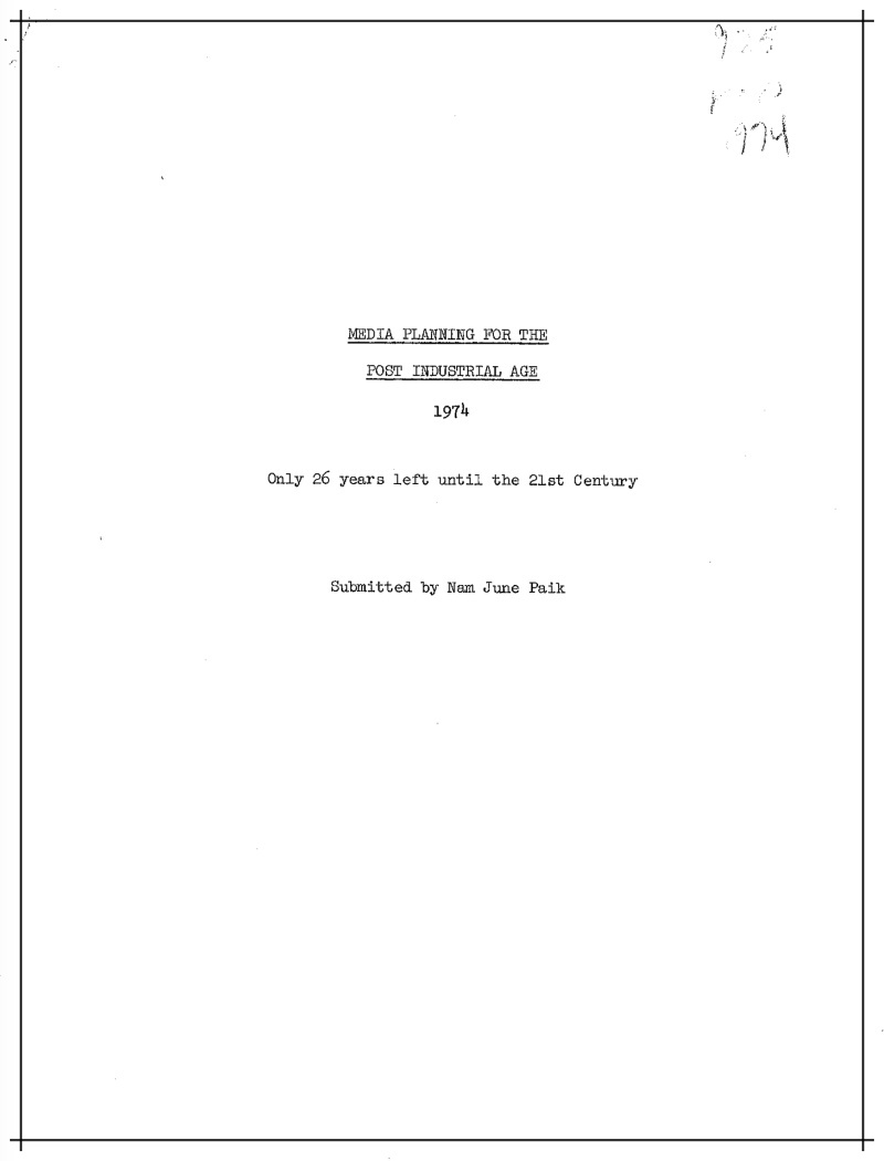Nam June Paik, MEDIA PLANNING FOR THE POST INDUSTRIAL AGE, 1974, PDF screenshot, p. 1. cover.