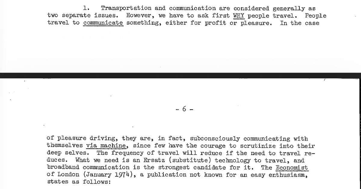 “교통과 커뮤니케이션은 일반적으로 별개의 문제로 취급된다. 그러나 우리는 먼저 ‘왜’ 사람들이 이동하는지를 물어야 한다. 사람들은 이익을 위해서든 즐거움을 위해서든 무언가를 소통하기 위해 이동한다. 목적지않이 즐거움 자체를 위해 하는 드라이브에서도, 운전자들은 사실 기계를 통해 자기 자신과 무의식적으로 소통하고 있다. 자신의 깊은 내면을 들여다볼 용기를 가진 사람이 드물기 때문이다. 이동의 필요가 줄어들면 이동의 빈도도 줄어든다. 우리에게 필요한 것은 이동을 대체할 수 있는 에르자츠(Ersatz, 대체재) 기술이고, 광대역 커뮤니케이션이 가장 유력한 후보다.”