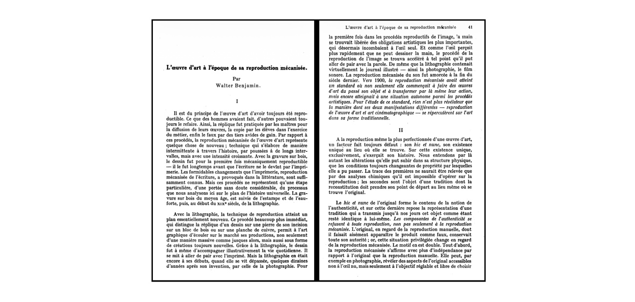 발터 벤야민의 「기계적 복제 시대의 예술 작품」이 처음 활자화된 지면. 나치 치하 독일을 피해 파리에 망명 중이던 벤야민은 이 글을 프랑스어로 번역하여 게재했다. 해방의 매체로서 영화가 가진 가능성과 그 동일한 매체가 파시즘의 선전 도구가 되는 아이러니를 동시에 직시한 텍스트가, 역설적으로 망명과 검열의 조건 속에서 세상에 나왔다. Walter Benjamin, “L’œuvre d’art à l’époque de sa reproduction mécanisée,” Zeitschrift für Sozialforschung, Jg. 5, Heft 1 (Paris: Librairie Félix Alcan, 1936), pp. 40–68. 디지털 원문: Internet Archive (archive.org)