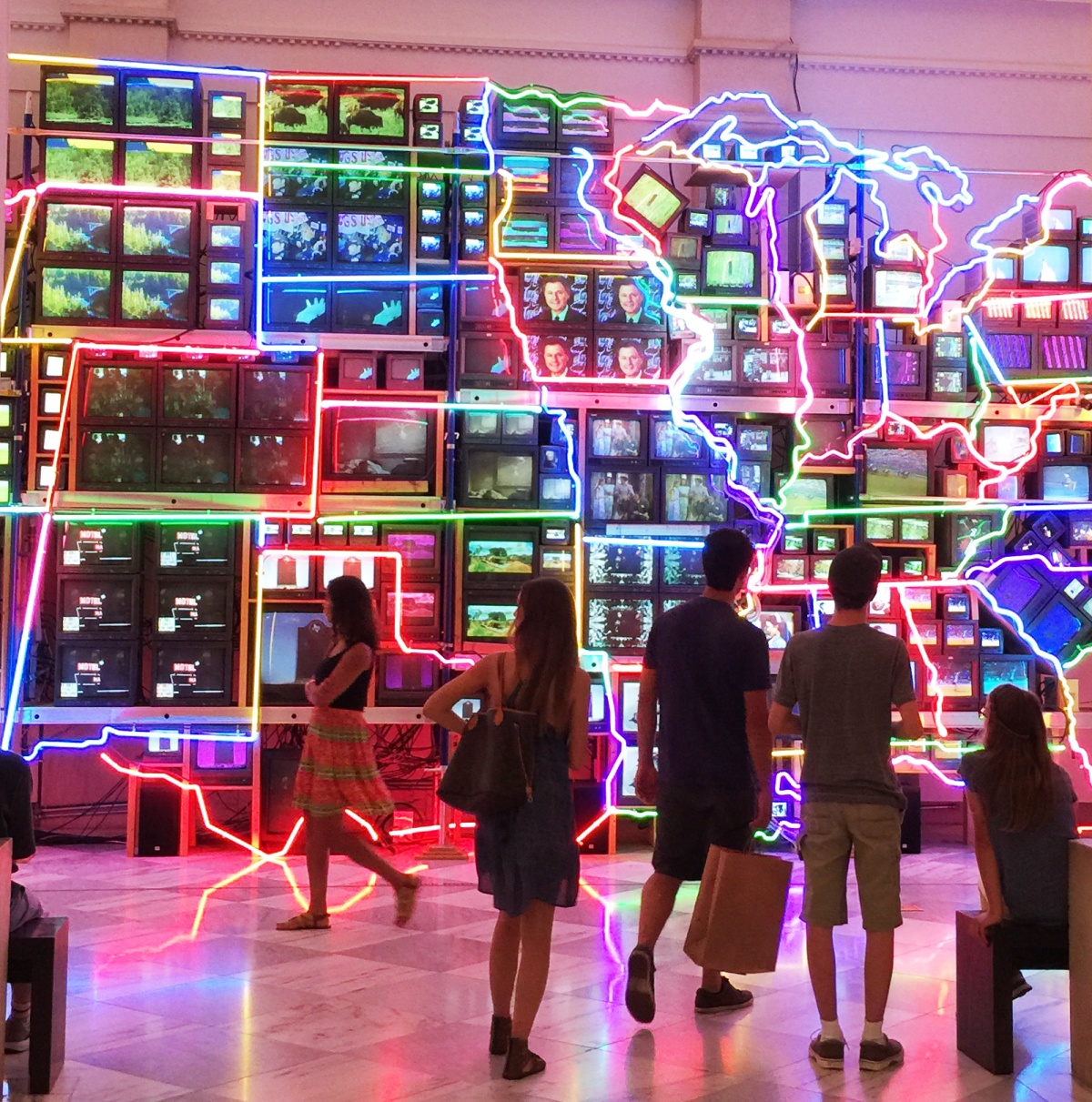 백남준이 1974년 록펠러 재단 제안서에서 처음 사용한 개념 “전자 슈퍼 하이웨이”를 21년 후 작품으로 실현한 작품. 336대의 TV 모니터와 네온 조명, 스틸과 목재로 제작된 51채널 비디오 설치로 미국 대륙 전체의 지도를 구성하며, 각 주(州)마다 해당 지역과 연관된 영상 클립이 재생된다. Smithsonian American Art Museum 교통망이 사람과 물자를 연결했듯, 전자 네트워크가 이미지와 정보를 연결하는 시대의 도래를 시각화했다. 그러나 동시에 수백 개의 화면이 동시에 쏟아내는 정보의 물량 자체가 이른바 “정보 과부하”를 체험하게 하며, 연결의 가능성과 그 과잉 사이의 긴장을 작품 안에 내장하고 있다. Electronic Superhighway: Continental U.S., Alaska, Hawaii. Photo by Amy Fox. https://americanart.si.edu/blog/superhighway-nam-june-paik © 2026 Smithsonian American Art Museum