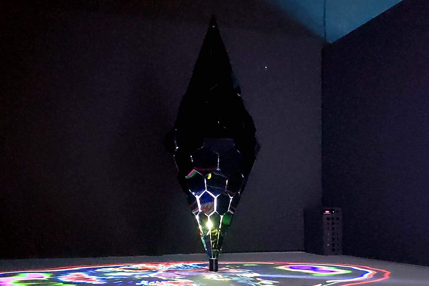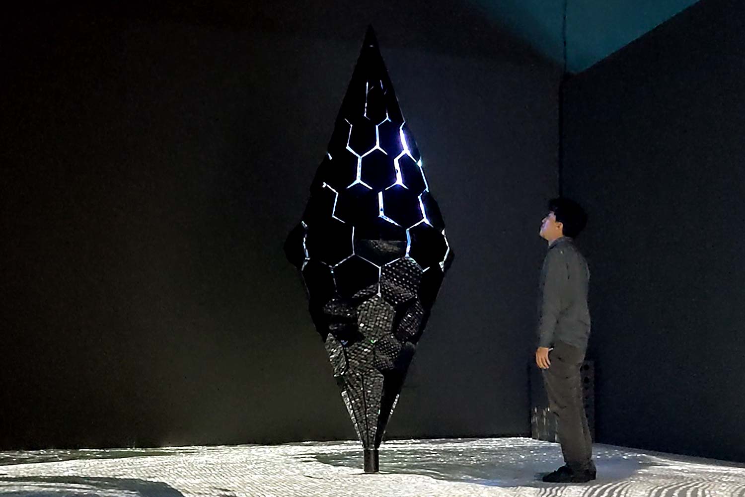 이모르텔(Immortel) 앞에 서면 가장 먼저 마주하는 것은 묵직한 음압처럼 밀려오는 기운이다. 다소 위압적인 크기의 세로로 길게 솟은 검은 형상은 마치 오닉스를 세공한 조각들을 이어 붙여 만들어진 외계의 존재 같다. 날카롭고 빛나면서도 동시에 어둡고 불투명한 표면은 가까이 다가갈수록 긴장을 발산한다. 외견상 큰 움직임은 없지만, 뾰족한 모서리로 중력을 이겨내며 균형을 잡고 지면에 살짝 닿아 반쯤 떠있는 그 상태만으로도 이미 어떤 ‘긴장’이나 ‘의지’가 깃들어 있는 존재임을 짐작하게 한다. 가까이서 들여다보면 표면을 덮은 육면체의 조각들은 미세하고 어긋나게 들락날락하는데, 그 움직임은 이 구조물이 천천히, 어떤 종류의 리듬으로 호흡을 하고 있음을 드러낸다.